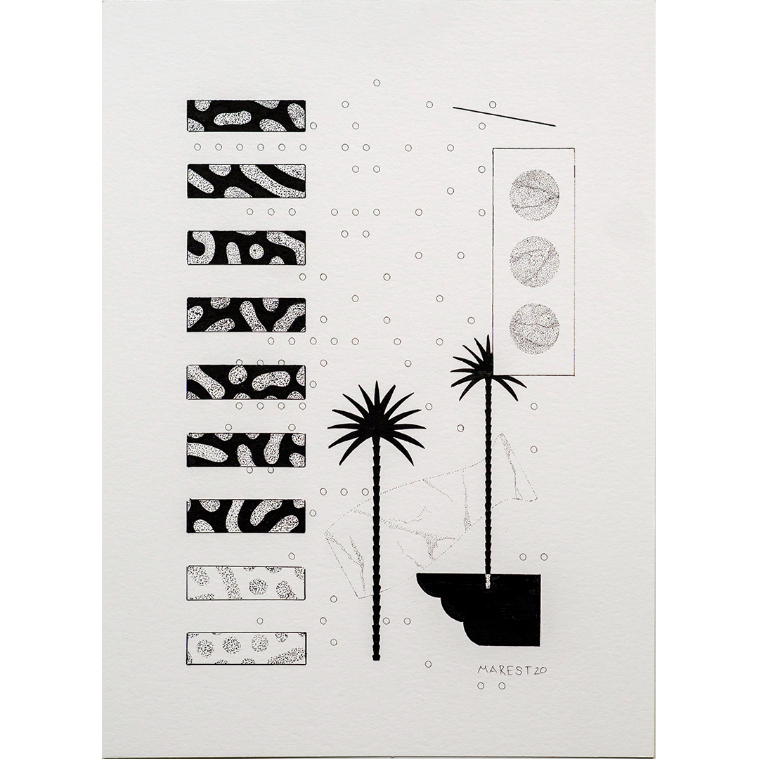 Marker drawings on Canson 300 g/m2 paper, cut out and fixed with entomological pins on panel; wood and glass frame