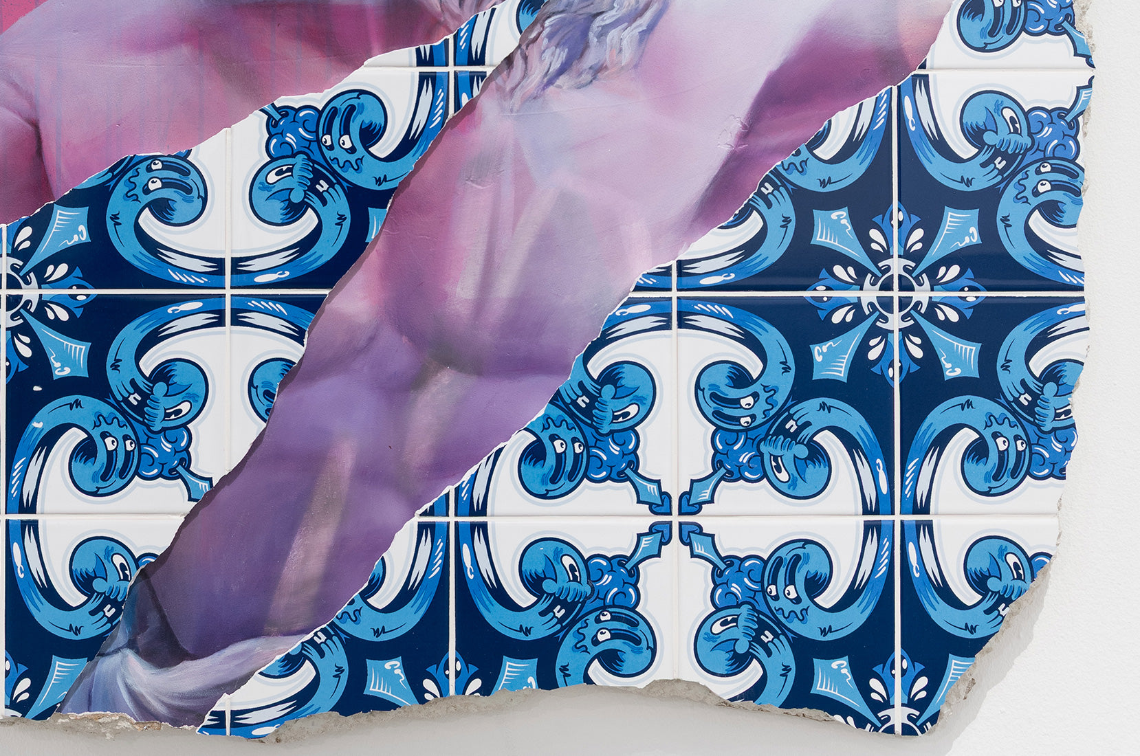 Spray, acrylic, oil paint and ceramic tiles on drywall