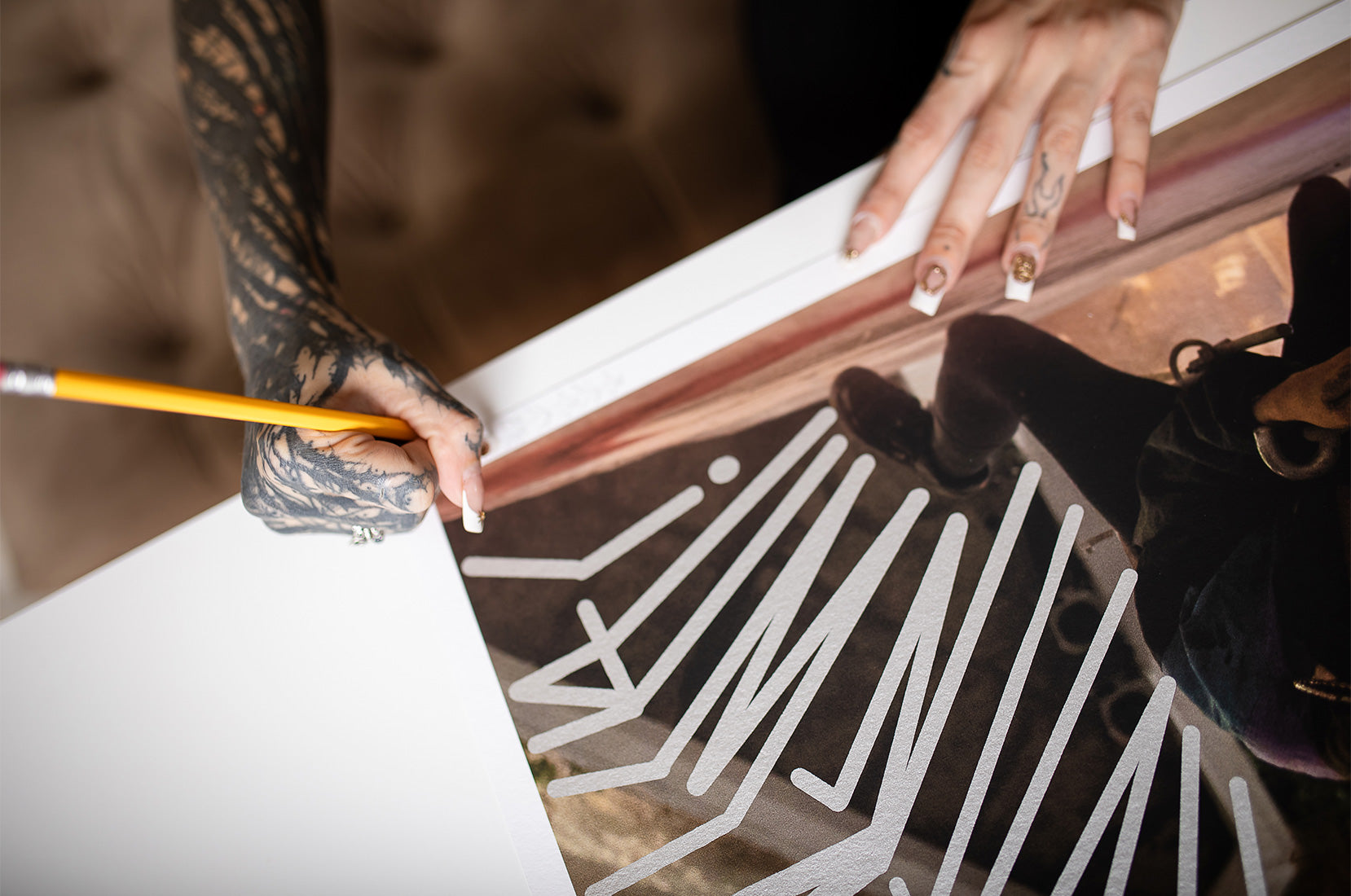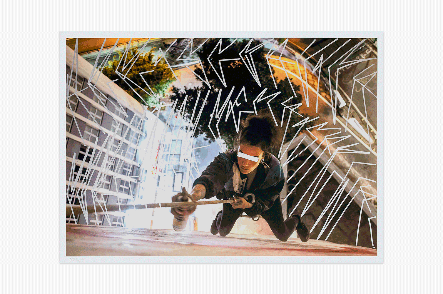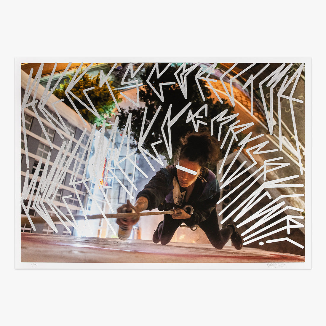 The female graffiti artist Irene Avramelos, known in the streets as Eneri, works from pixação, the São Paulo urban writing practice that has become one of the city’s most powerful visual and political marks. Rooted in risk, visibility, and territorial presence, pixação is both writing and action - and in Eneri’s work, it becomes a declaration of love for the street. Her edition is grounded in lived experience, where the body is suspended, exposed, and placed in direct tension with the urban space. Over the photograph, pixação intersects with her own lettering, bringing the written phrase: “I risk my life for loving the street too much.”