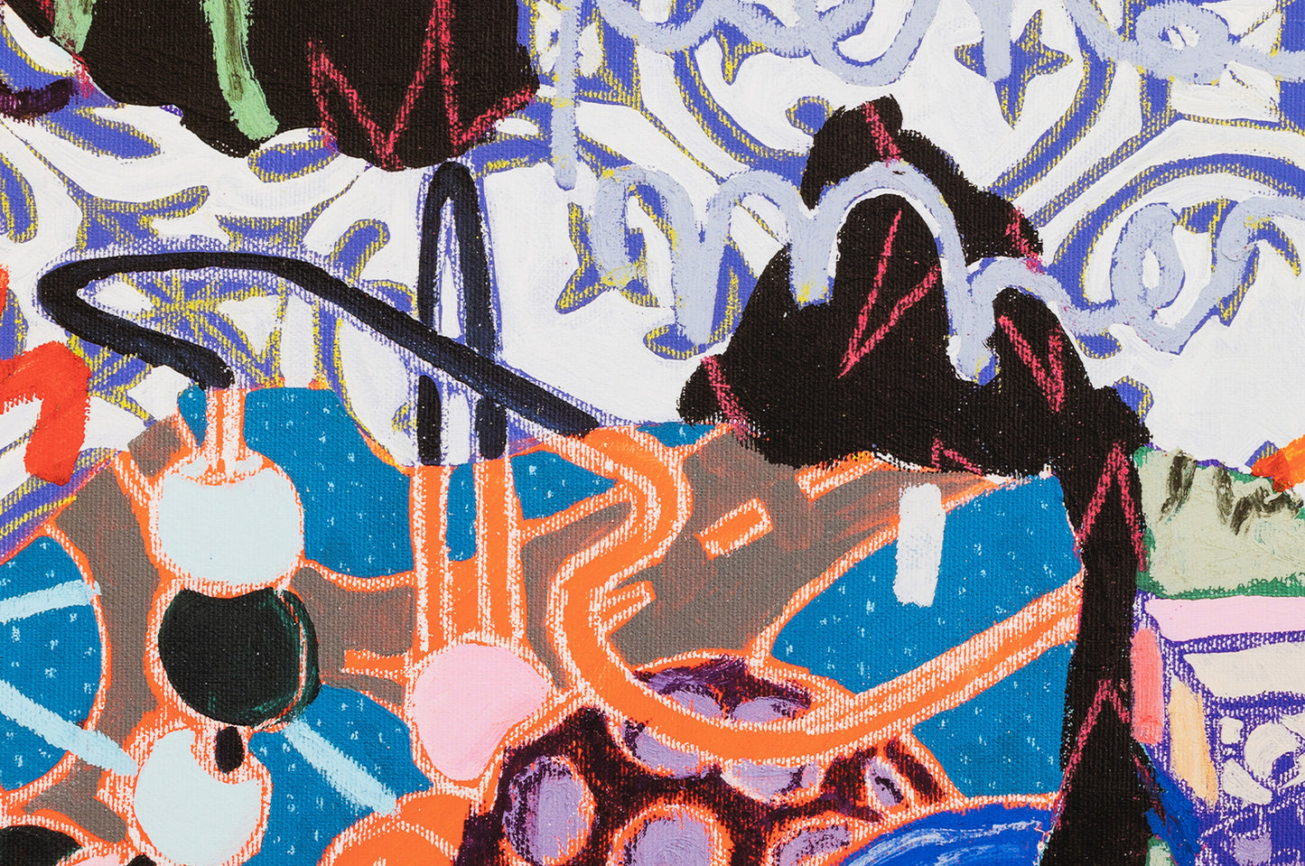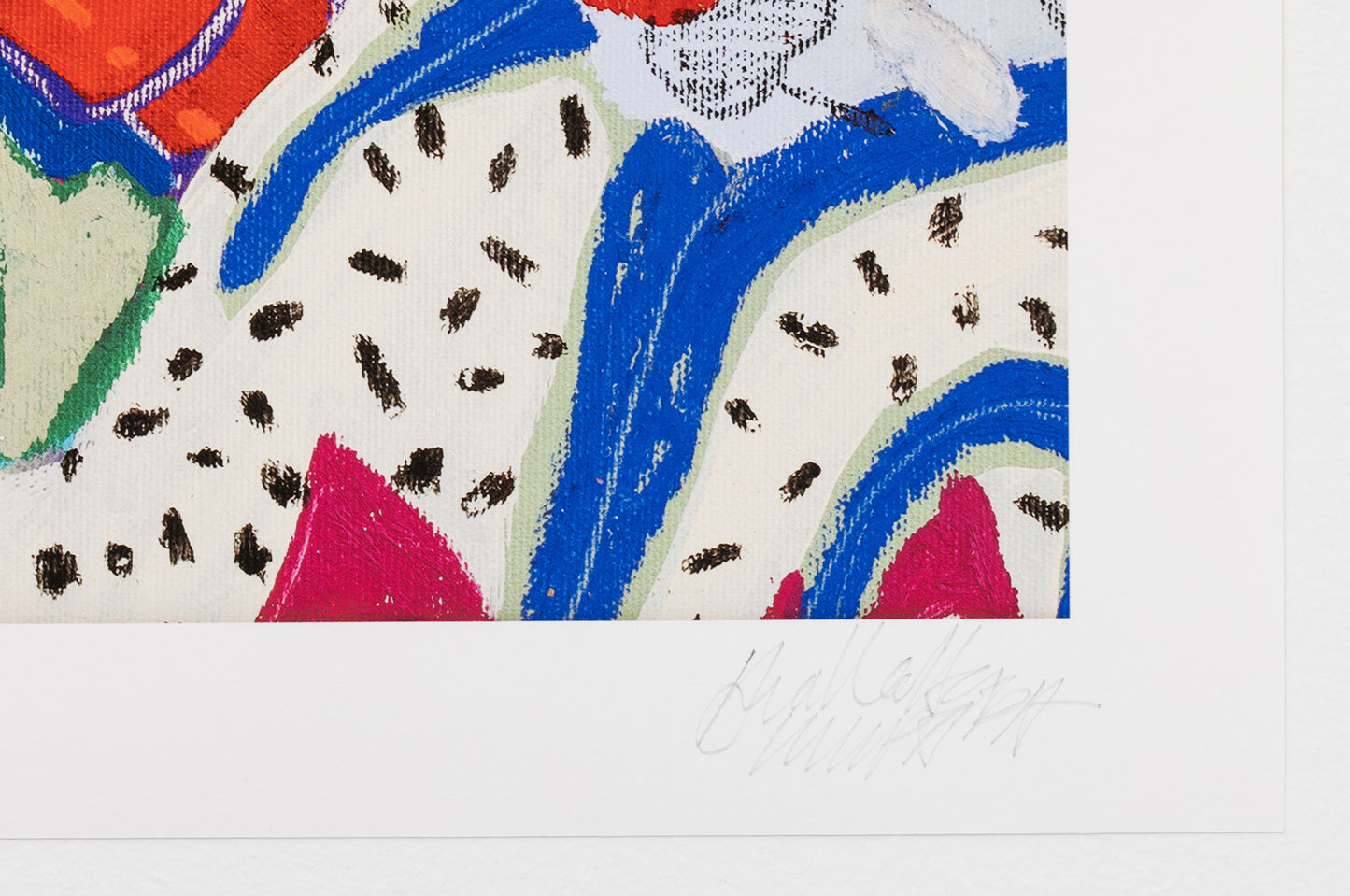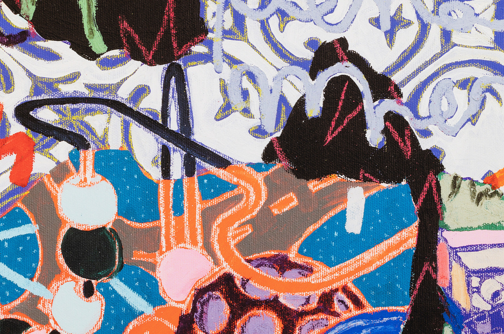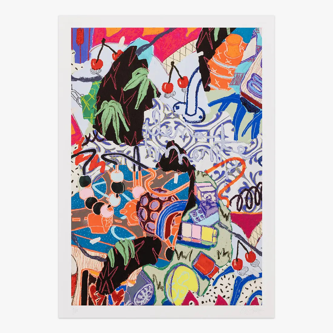 BRINCAR com letras grandes("PLAYING in big letters") is a visually vibrant and provocative composition that delves into the ambiguity between playfulness and truth, lightness and emotional manipulation. The work confronts the viewer with a saturated visual universe - filled with childhood references, fragmented objects, and clashing textures - orchestrated within an intentional chaos.At the heart of this whirlwind lies a subtle yet loaded question: “Plena mente?” (a wordplay in Portuguese suggesting both “fully conscious” and “full of lies”). The phrase operates as both riddle and critique, questioning the social habit of saying something honest in the form of a joke - only to quickly retreat behind the phrase “just kidding” when vulnerability is exposed. A gesture that simultaneously reveals and denies.The painting becomes a reflection on dishonesty wrapped in playfulness, where a playful aesthetic is used to camouflage deeper emotional tensions. Visual elements like cherries, childlike patterns, and abrupt cutouts serve as metaphors for the desire to express honesty. “BRINCAR com letras grandes” refuses the superficiality of joking and invites a reflection on the courage it takes to stand by the truth - even when it arrives masked as laughter.