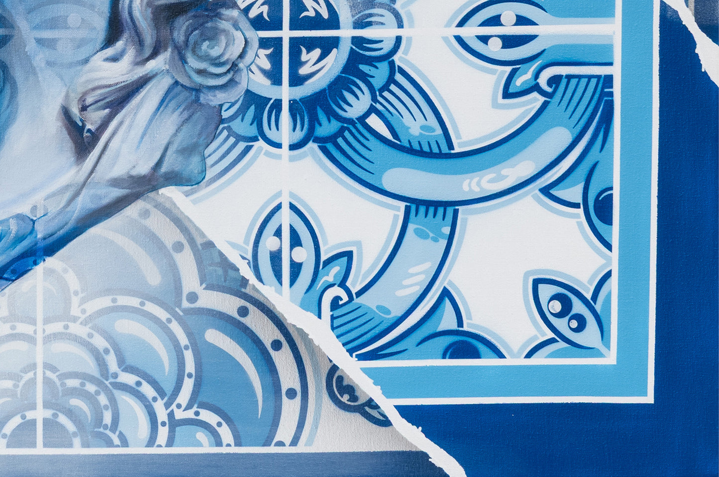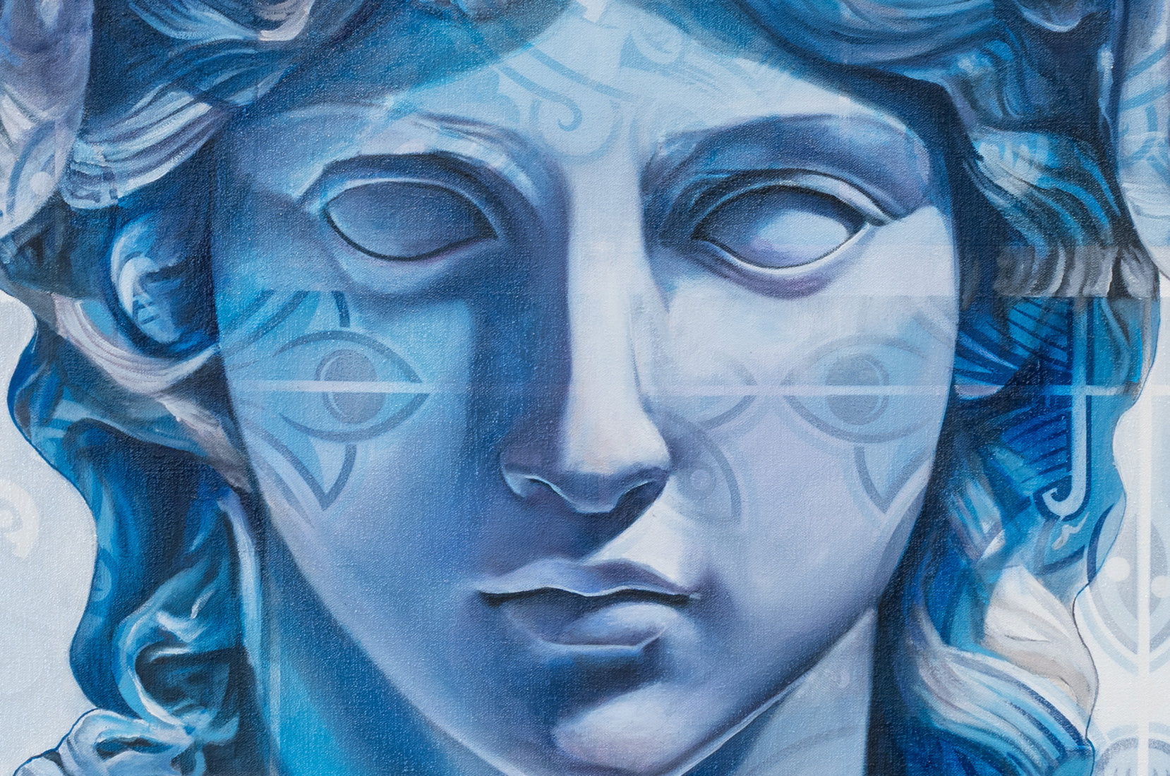 Monumental deities and symbols reinterpreted in expressive brushwork and vibrant tones.