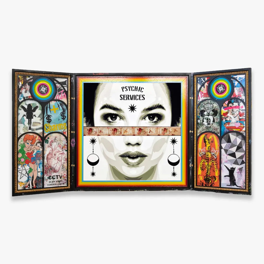 Original box-crate canvas, aerosol, acrylic, fabric, polycrylic stencil/transfer works, partly coated with high-gloss resin, central striped frame, black multi-window mounts, and gold-beaded side frames