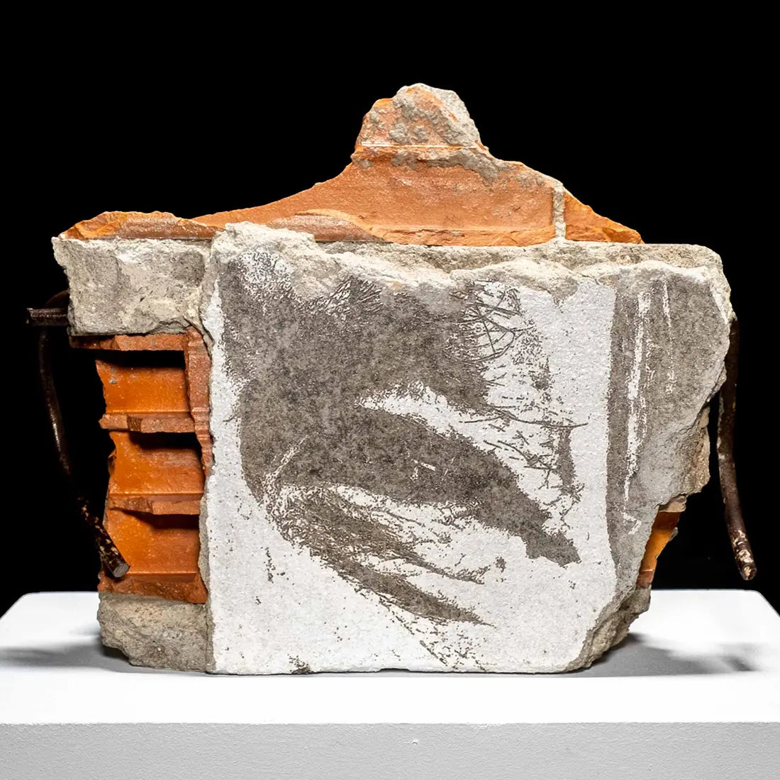 Laser-engraved fragment from demolished building (brick, plaster, concrete, paint)