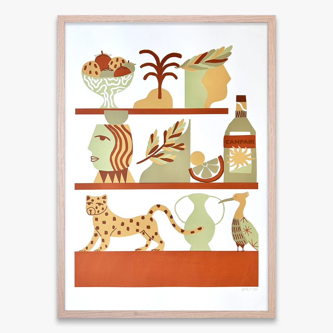 Rome’s layered history and warm color palette resonated deeply with Madi’s intuitive practice. Walking without strict plans allowed spontaneous discoveries to shape her sketches. From architectural grandeur to everyday objects, she gathered fragments of experience that later converged in her studio. The print weaves together symbols from Vatican frescoes to nightlife details, blending personal memory with collective heritage. Rich ochres and expressive forms reflect the city’s timeless atmosphere, transforming a week of exploration into an imaginative and vibrant visual diary.