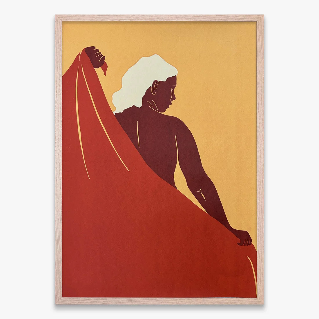 In Nairobi, Elléna Lourens experienced warmth and hospitality that reshaped her perception of connection across Africa. Inspired by Maasai textiles and the symbolic presence of blankets in daily life, she developed a composition centered on protection and comfort. The print portrays a figure wrapped in patterned fabric, embodying both literal observation and emotional memory. Through simplified forms and balanced color, the work conveys cultural richness and shared humanity, translating a welcoming experience into a tender visual statement.