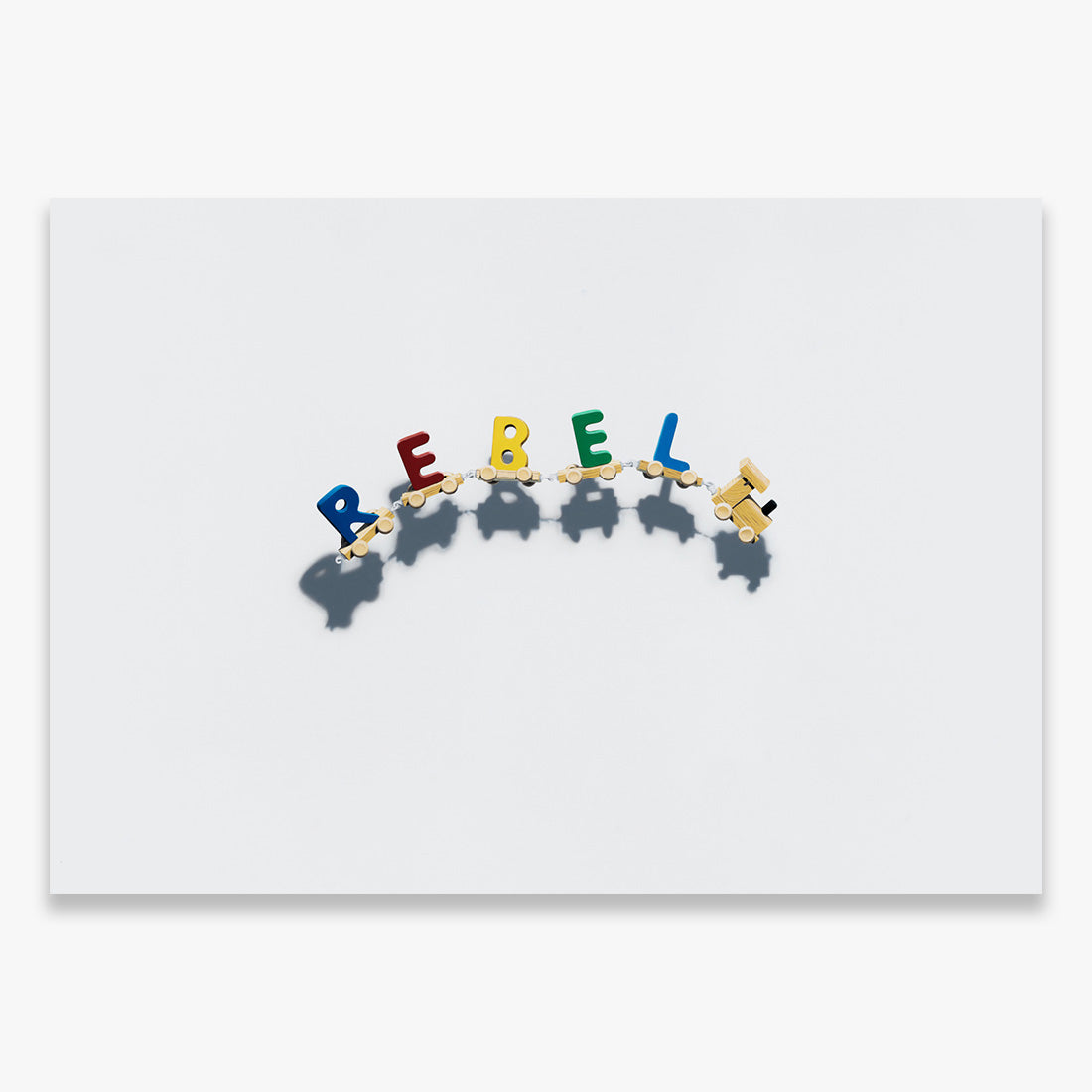 trains that spell out different words, blending the playful charm of children’s toys with the raw